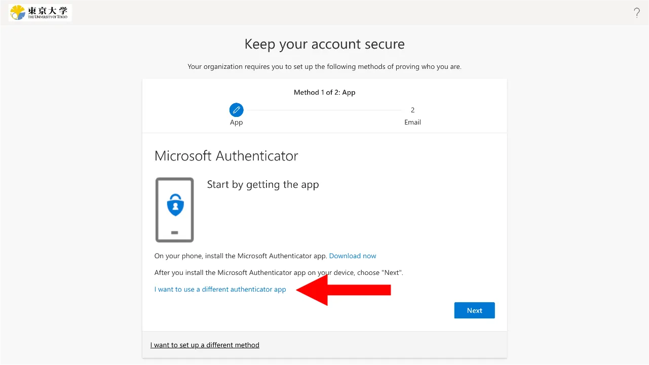 3. Click “I want to use a different authentication app”.
