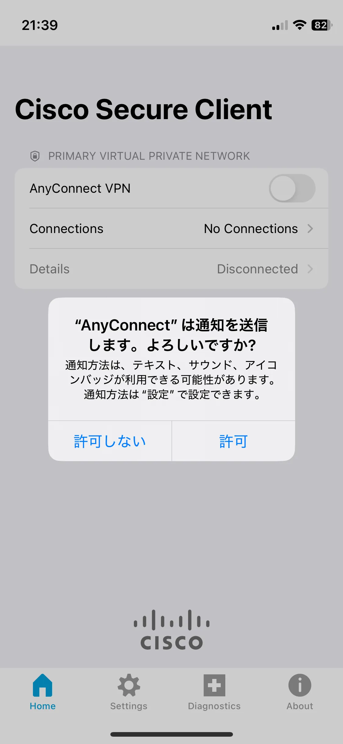 手順B: インストールを終えてSecure Clientアプリを開くと,下図1枚目のような画面が出ることを確認します.これでインストールは完了です.なお,開く際に下図2枚目のように通知の送信について確認する画面が表示されることがありますが,いずれを選択しても構いません.