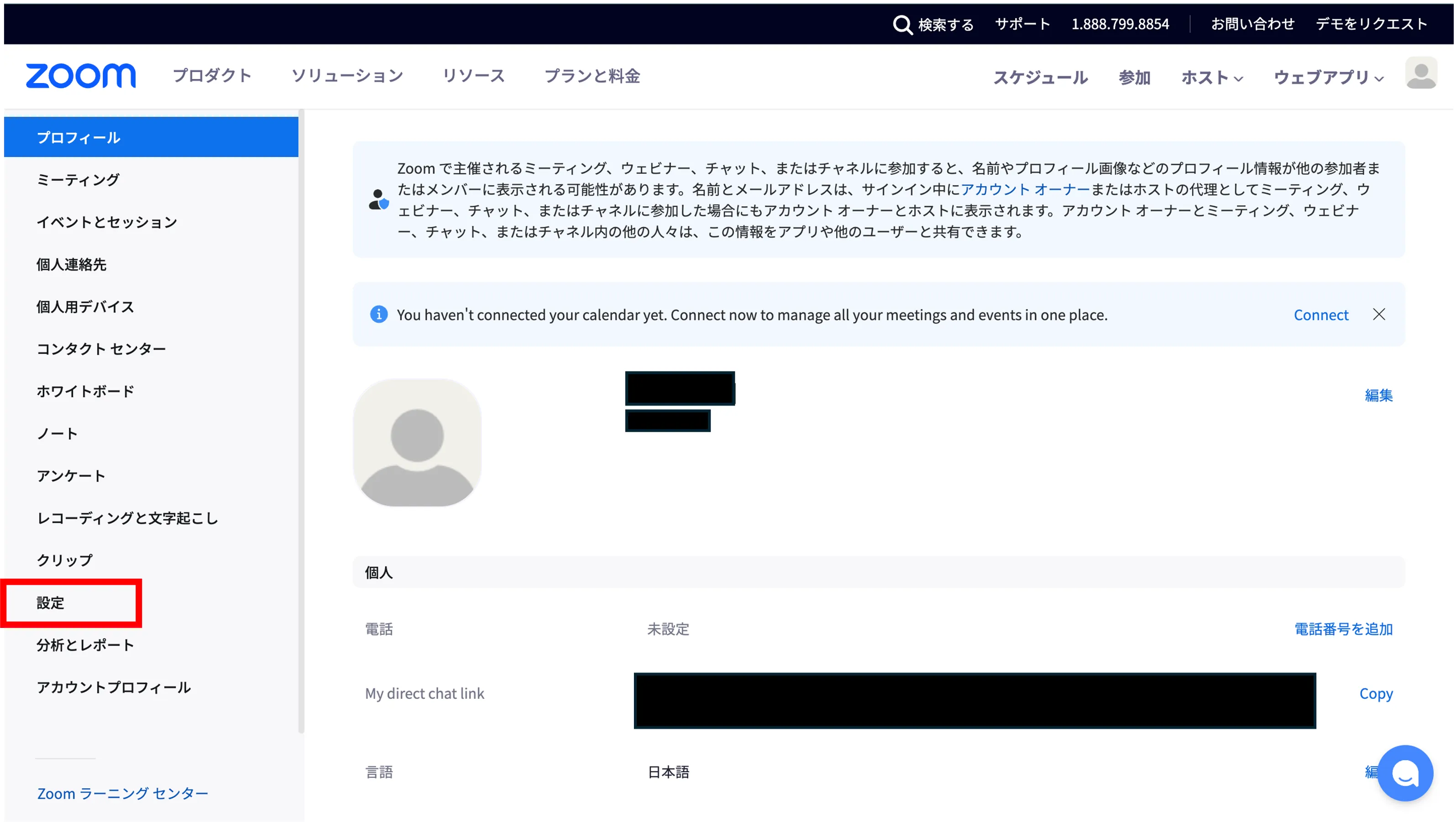 - 「Zoom サインイン方法」を参考にしてブラウザでZoomのウェブポータルにアクセスし,「設定」を開いてください.