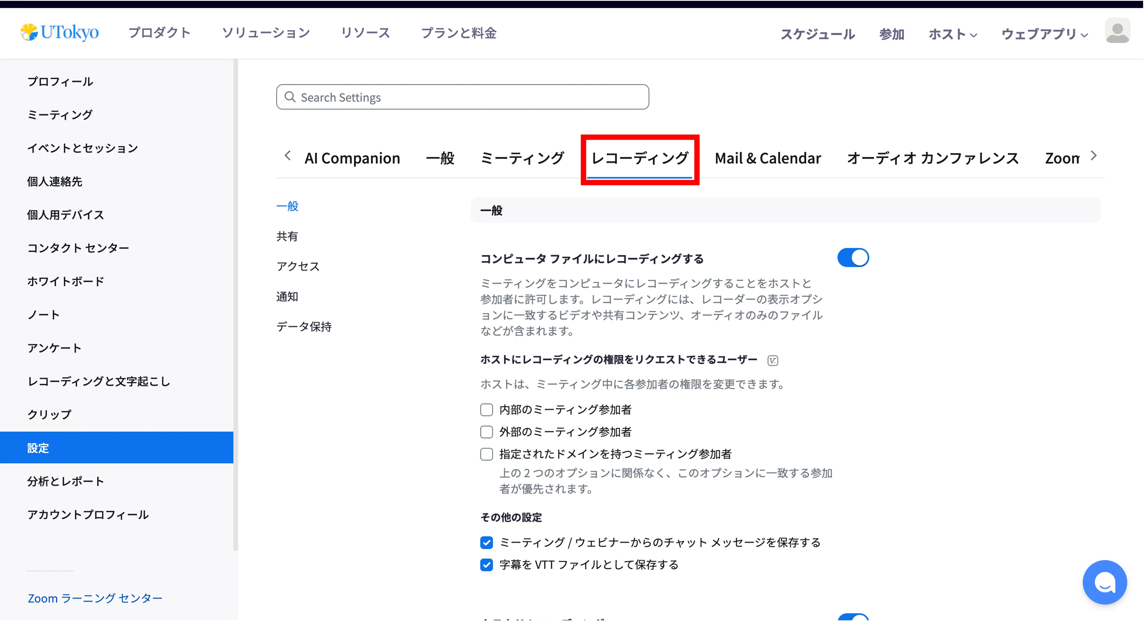 - 「一般」セクションの「クラウドレコーディング」のトグルをオンにし,「ミーティング / ウェビナーからのチャット メッセージを保存する」にチェックを入れください.その上でクラウドレコーディングをすると,チャットの内容も自動でクラウドに保存されます.